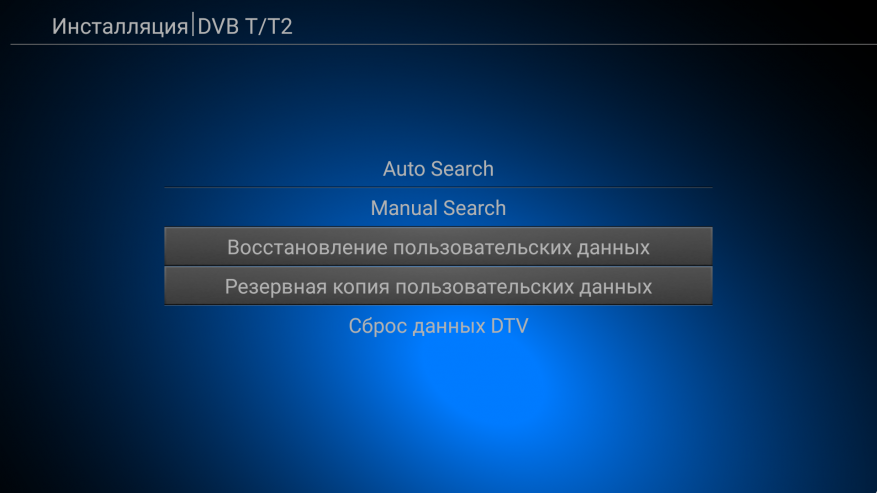 Ну и подключив антенну в комнате, я начал поиск каналов я получил полный облом. Приставка не нашла ни одного канала. Все дело в том, что окна выходят в противоположную от телевышки сторону и сигнал глушиться бетоном самого дома. В общем пришлось брать монитор и идти на балкон (кабель я по неосторожности взял 2 метровый). И тут уже нашло все каналы. Сам процесс довольно простой. Я запустил приложение DTV, оно предложило найти каналы. Интерфейс на русском языке, но перевод местами с ошибками. Это я заметил сразу на «просканирвоать каналы». Ну да ладно, нужно просто один раз настроить, опечатки можно потерпеть, главное что все понятно. Далее выбираем, что будем искать. Т.к я подключил обычную антенну, то выбрал эфирное тв — Т2.