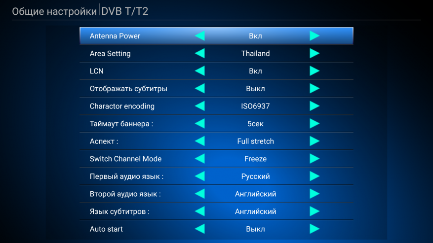 Последний пункт в меню это настройки. Здесь нужно в первом пункте «Antenna Power» включить функцию. Это питание для усилителя антенны, по умолчанию — выключено. Если у Вас антенна как у меня с усилителем, то это существенно улучшит качество приема. Остальные пункты я не трогал - регион стоит Тайланд, но все работает. Видел пару сообщений, что не находит каналы, пока не изменить регион на Францию, но у большинства все находит и так. Так же есть настройки родительского контроля, если вы хотите ограничить доступ детям к определенному каналу.