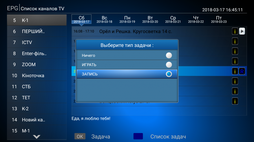 Следующий пункт самый интересный — EPG (Electronic Program Guide). Здесь программа телепередач, в которой можно планировать действия. Например что бы включить программу в заданное время или записать телепередачу на внешний носитель.